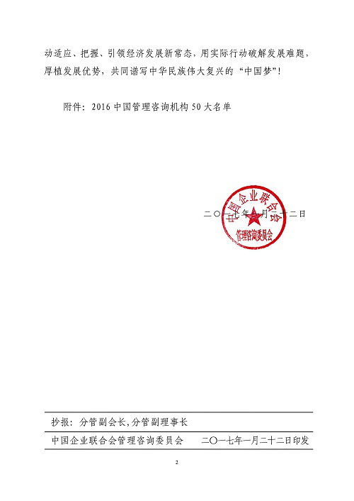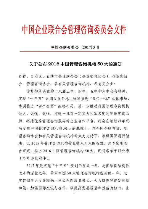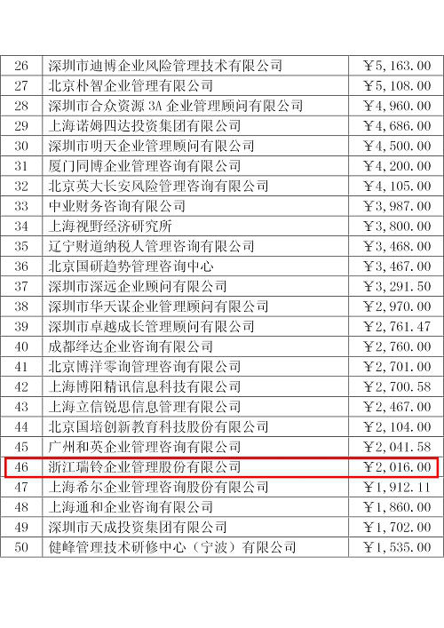 近日,中国企业联合会管理咨询委员会颁布了2016中国管理咨询机构50强名单,浙江瑞铃企业管理股份有限公司排名第 46位.