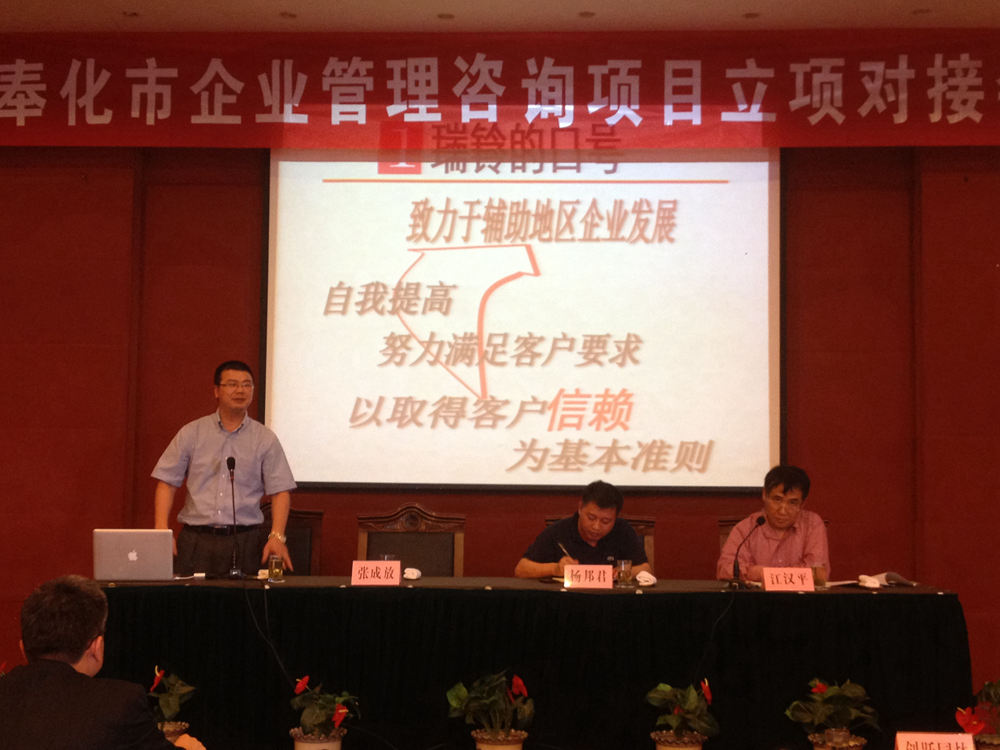 继参加宁波市2012年度"百家中小企业诊断计划"企业对接会后,我公司又受奉化市经济和信息化局的邀请,于5月15日参加奉化市企业管理咨询项目立项对接会.公司董事长陶学定在会上介绍了瑞铃公司的概况和精益生产的理念.图为董事长陶学定的演讲照片