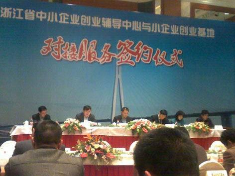 为贯彻落实《省政府关于促进中小企业创业创新若干意见》【2010】4号文件,大力培植区域经济增长源,积极助推小企业又好又快成长,形成大中小企业协调发展、梯度推进的良好格局.4月23号下午由省中小企业局主办的中小企业创业辅导中心与小企业创业基地对接服务活动中,浙江省副省长金德水同志和中国工信部中小企业司司长王建翔同志到会并作重要讲话.我公司代表出席并作为省28家创业辅导中心之一参与此次对接服务协议的签订.