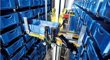 特点:对应单深位和双深位箱式货架,每个巷道设一个堆垛机,在天地轨间运行
