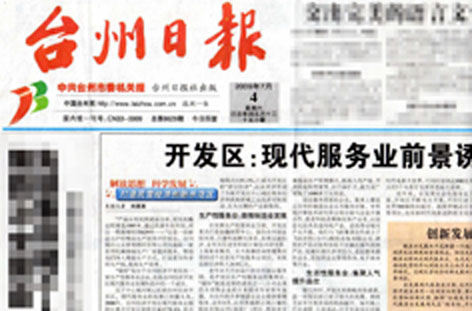 7月4日作为中共台州市委机关报的台州日报在头版头条发表了一篇题为"开发区:现代服务业前景诱人"的报道.以我公司最近的一份精益生产效果评价报告为开头,对我公司做了大篇幅报道(附图),提到了"我公司为温岭一家农用机械曲轴生产厂提供服务,导入精益生产方式,打造更为科学的生产线,提高生产效率","去年3月,公司承接浙江钱江摩托股份有限公司项目,帮助其实施精益生产管理模式,提高人均产能、节省场地和货架等,运行10个月就为该长增加了1000多万元效益"等.