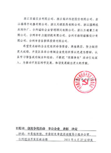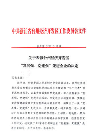 在举国欢庆中国共产党成立90周年之际,开发区党工委召开大会,对深入开展"争当发展强、党建强先进企业"活动,促进企业转型升级、实现企业持续健康发展充分发挥战斗堡垒作用的先进企业进行表彰.对10家非公有制企业授予"发展强、党建强"先进企业称号,我公司获此殊荣.