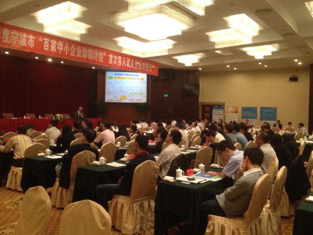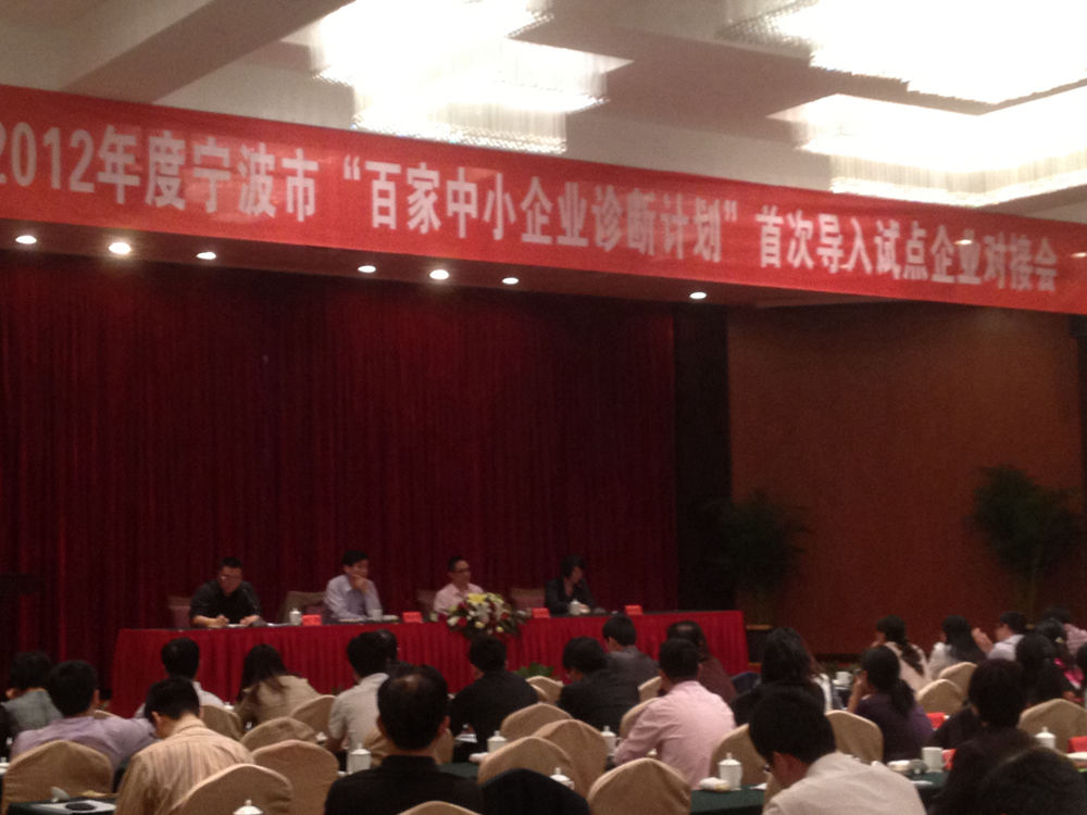 我公司受宁波市经济和信息化委员会邀请,于4月25日参加2012年度宁波市"百家中小企业诊断计划"首次导入试点企业对接会.我公司是唯一一家受邀的宁波市外咨询公司.公司董事长陶学定在会上就管理咨询的导入发表了长达一个多小时的演讲.内容得到了主办方及出席企业家的高度肯定,反响强烈.通过本次演讲,使宁波企业家对管理咨询的导入有了更深入的了解,也使得越来越多的企业投身到内部管理体制的改革当中.
