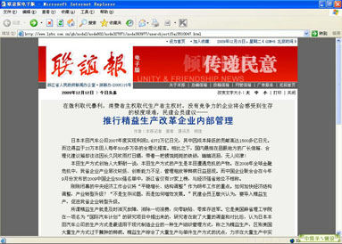 自7月4日台州日报头版大篇幅报道我公司的精益生产成效后,12月12日,精益生产又一次被提到风口浪尖成为焦点.题为"在微利取代暴利,消费者主权取代生产者主权时,没有竞争力的企业将会感受到生存的极度艰难,民建会员建议——推行精益生产改革企业内部管理"的头条新闻犹如一颗重磅炸弹来袭,威慑四方.作为各级政协委员、党政领导干部、知识界人士和成功民营企业家们的喜爱读物,享有"有识之士的声音,有识之士的报纸"美誉的联谊报发表了该文章.